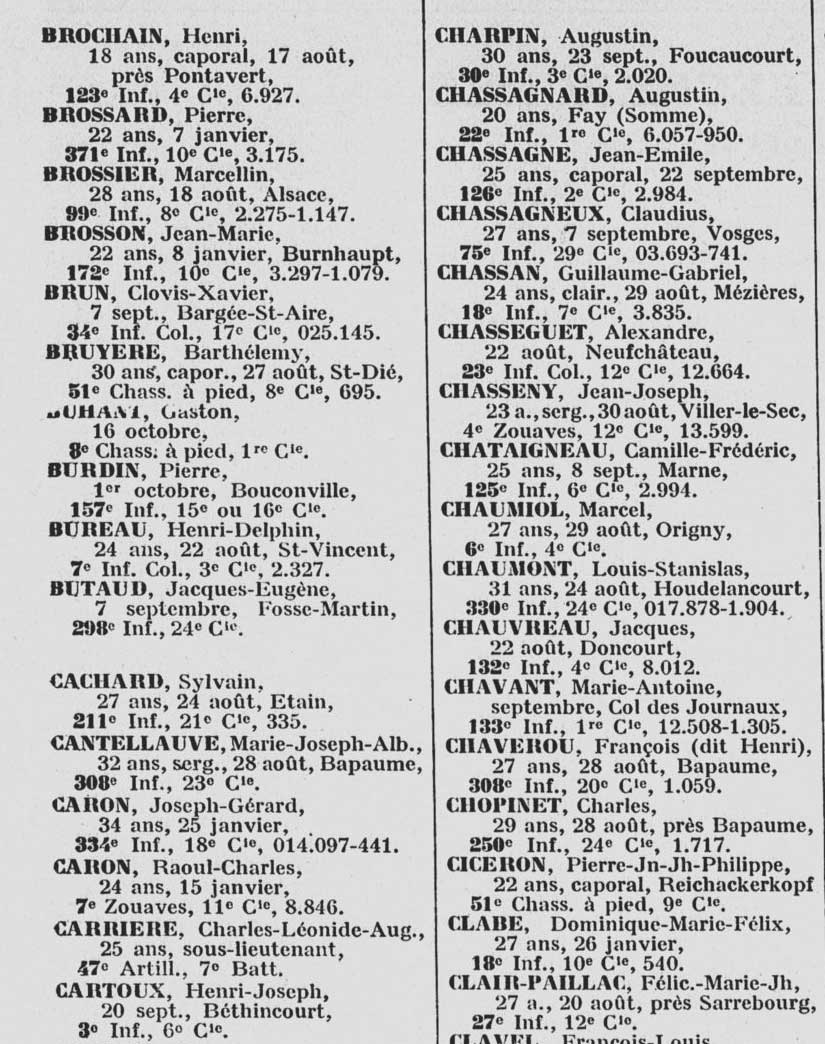 | Nom [rectifié] | Prénom(s) [rectifié(s)] | Age | Grade | Disparu | Unité | Compagnie | Autre sous-unité | Tous champs indexés | MDH | Adresse | Dpt/N | Mdh/Nom | Mdh/Prenom(s) | MPLF | Jugement | |